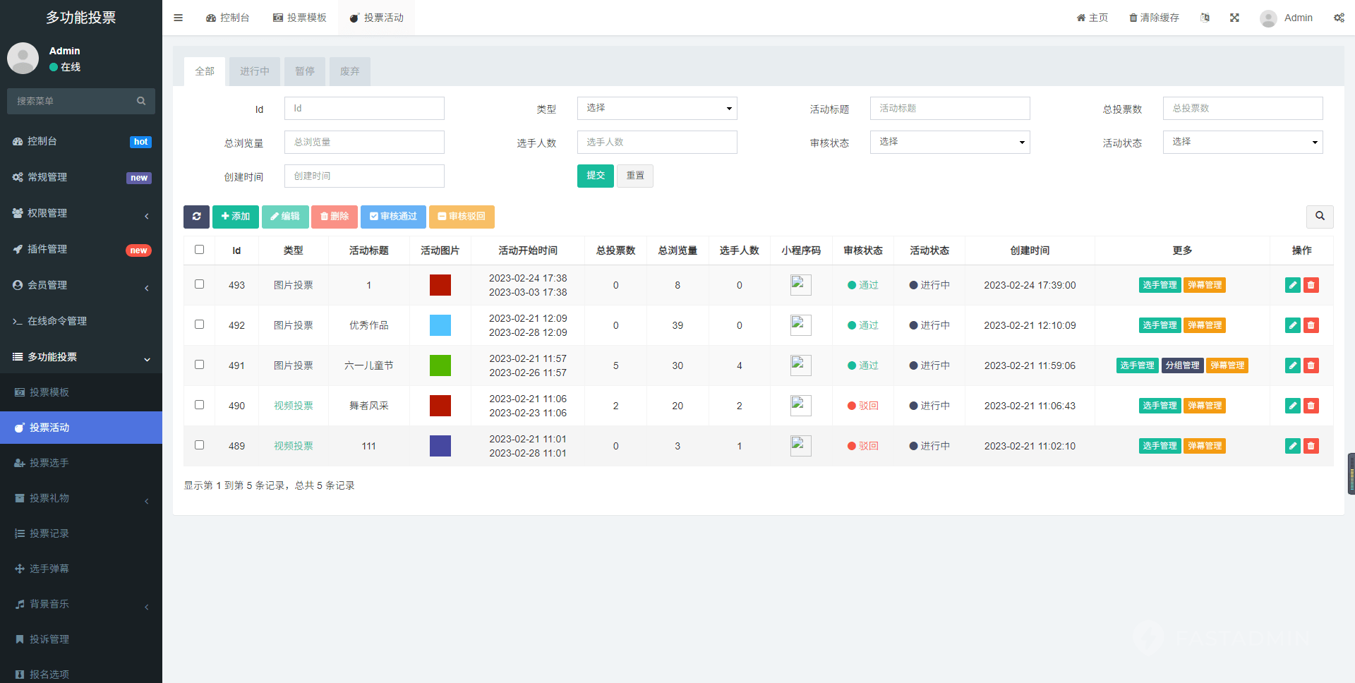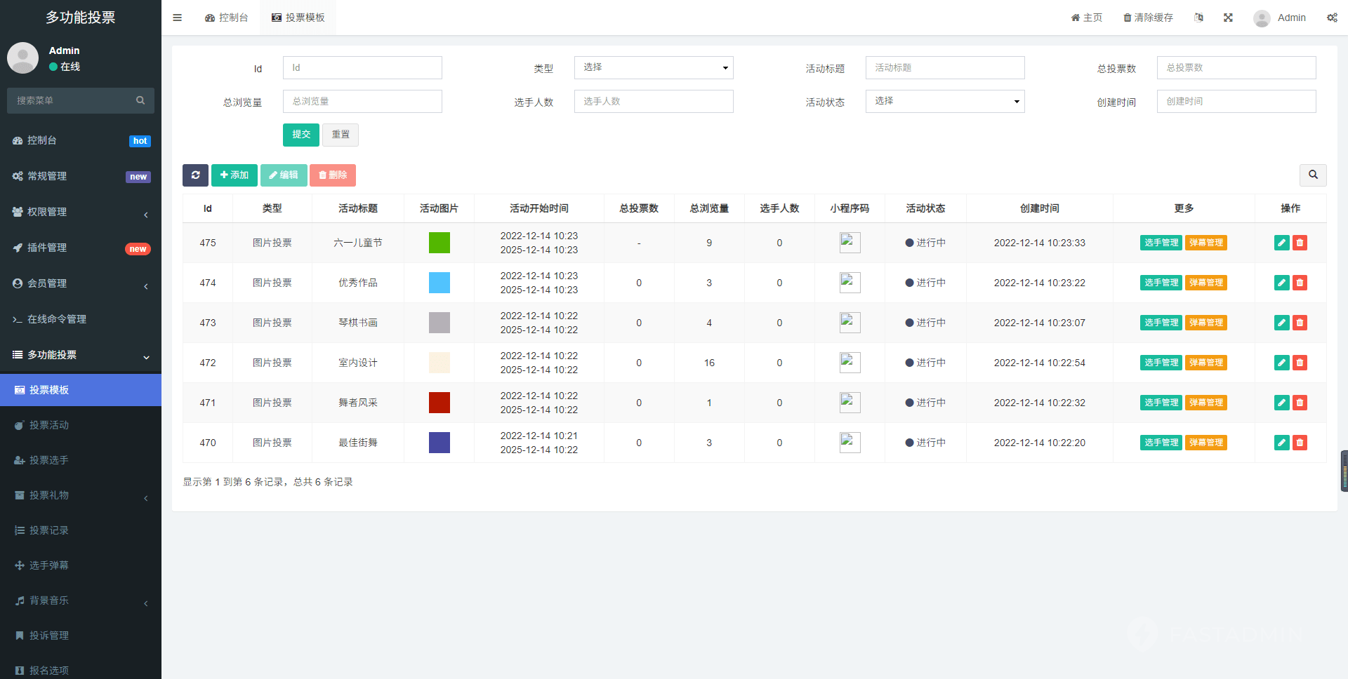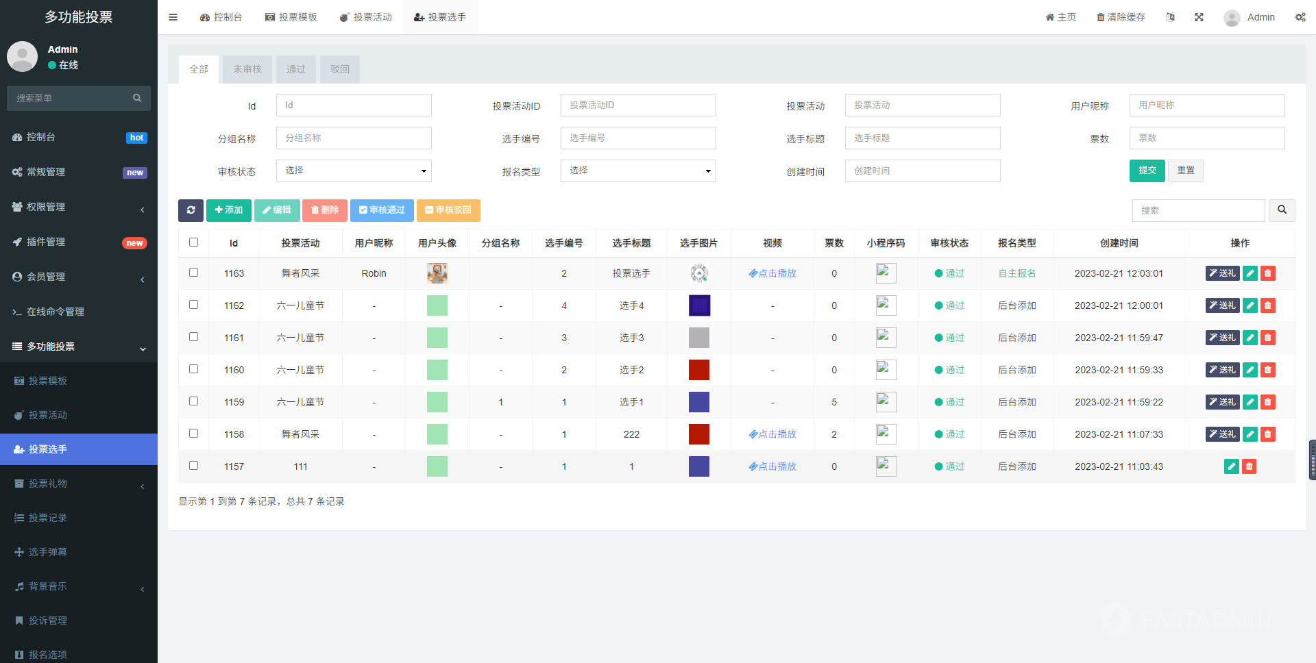 6、投票选手:支持后台送礼,可修改票数,批量审核