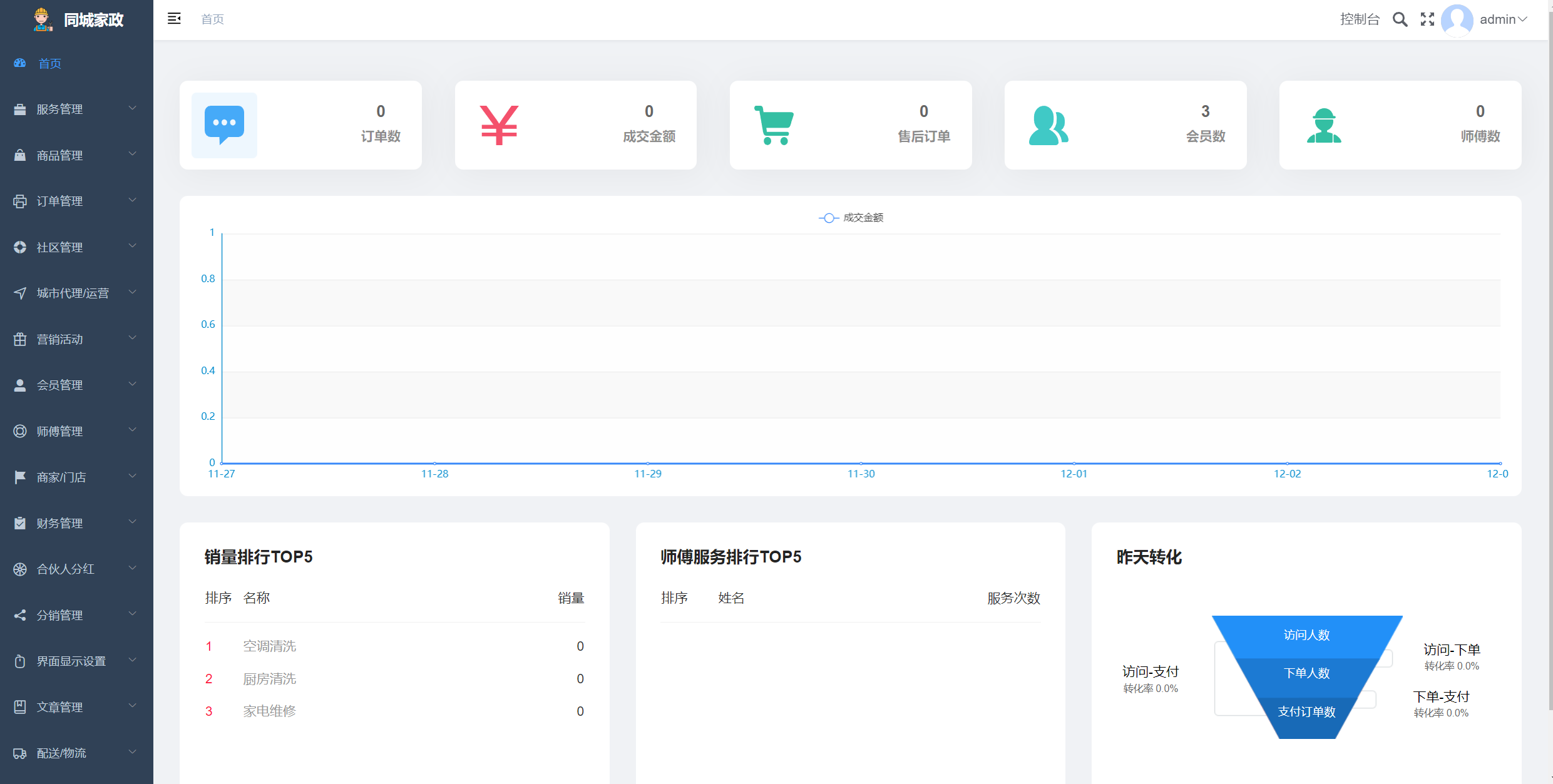 同城到家家政服务微信小程序,前后端全开源可进行二次开发,提供家电维修、家政、装修、上门安装等服务,服务可自定义,功能非常完善,多平台管理,无限添加平台,平台之间数据隔离,还包含社区、城市代理、营销活动、师傅入驻、店铺入驻、合伙人、分销管理、商城系统,前端界面DIY,附带详细搭建文档!