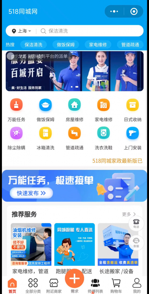 小程序端功能:保洁清洗、做饭保姆、家电维修、搬家拖货、管道疏通、房屋维修、上门安装、跑腿上门、养生服务、发布需求、在线派单。