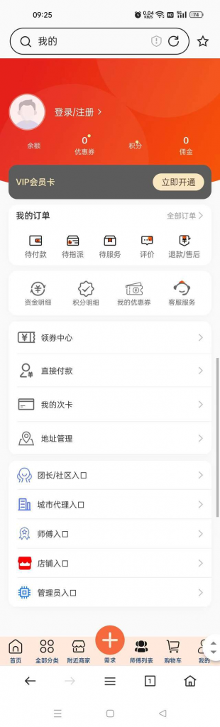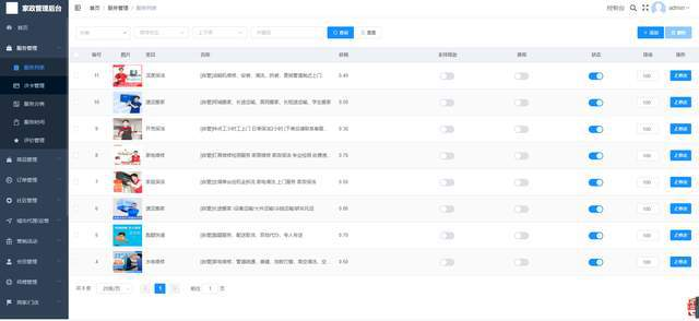 系统功能描述:服务管理、商品管理、拼团/秒杀、订单管理、会员管理、派单管理、师傅管理、商家/服务点、财务管理、城市代理、次卡管理、分销积分、diy设计、营销活动、文章管理、配送/物流、管理员/用户、系统配置等功能。