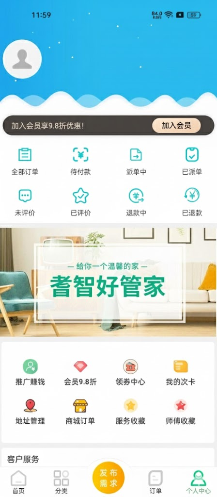 服务管理、商品管理、订单管理、会员管理、师傅入驻