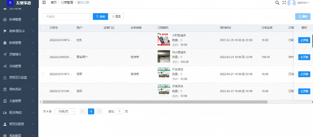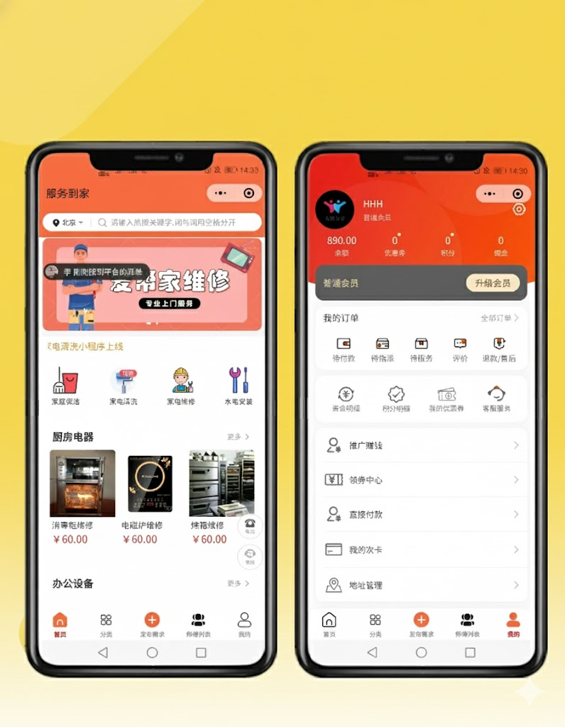 功能介绍:家政派单、营销活动、上门预约技师接单、商家入驻、区域代理