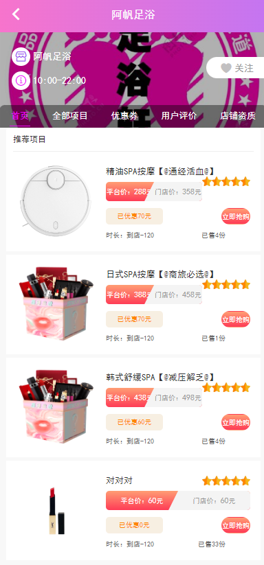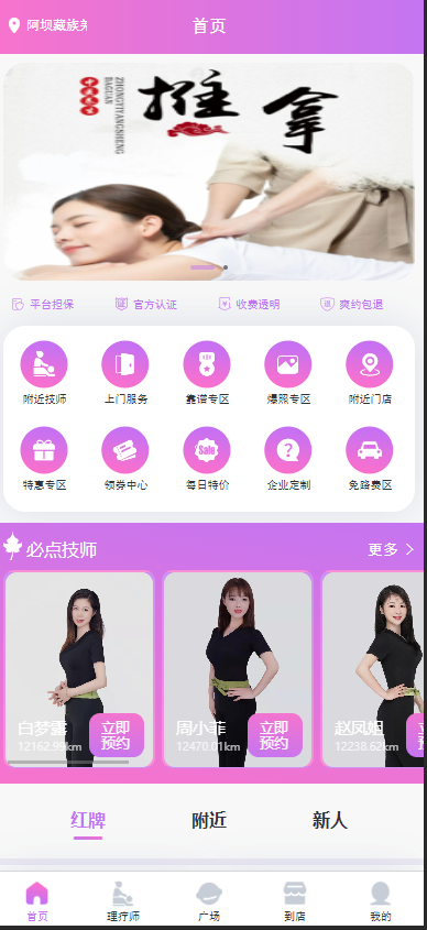 项目展示: 技师选择 预约服务 优惠券 订单 意见功能 城市加盟功能 技师推荐 文章管理 业务员 渠道商 代理商