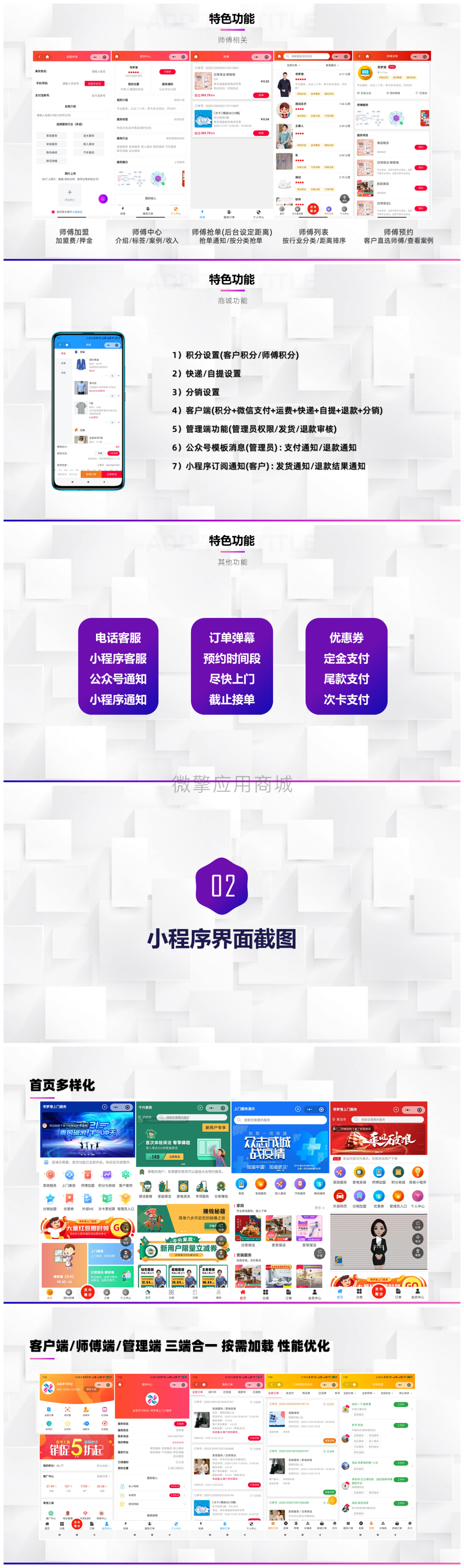 上门预约服务小程序是一款家政上门预约服务应用小程序,主要以单区域(或者不设置城市),不支持商家入驻(商家可以以个人师傅名义入驻),后台功能强大,派单模式多样化。维修师傅可以抢单,管理员可以派单,支持客户选师傅,还有分销推广,会员折扣,积分兑换,次卡功能等营销工具。