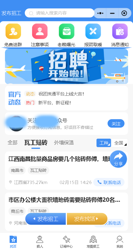首页找活信息:可以按照工种、地区 进行筛选