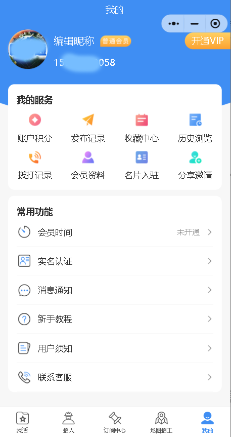 我的: 开通VIP:可以按照工种开通VIP 开通之后 相应的工种发布招工信息免审核 拨打电话免费