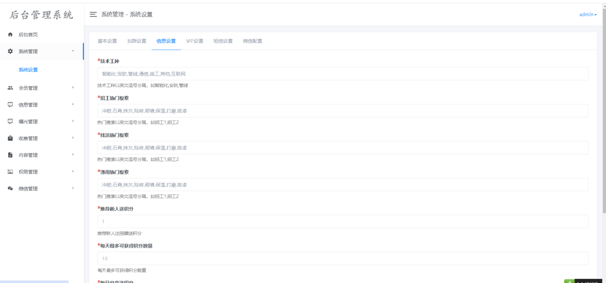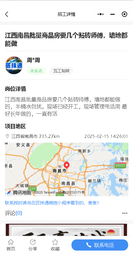 发布招工:可以发布招工的信息 电话联系人 项目工期 具体位置 和技术工种 可以选择置顶 前端发布后台审核