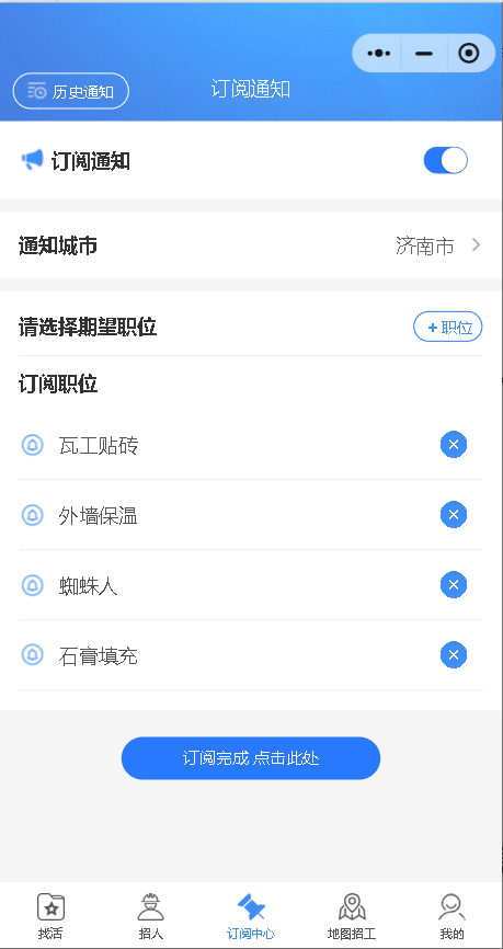 订阅中心:可以按照 城市 期望职位 把相关职位z新消息推送到微信一边及时获取z新招聘信息