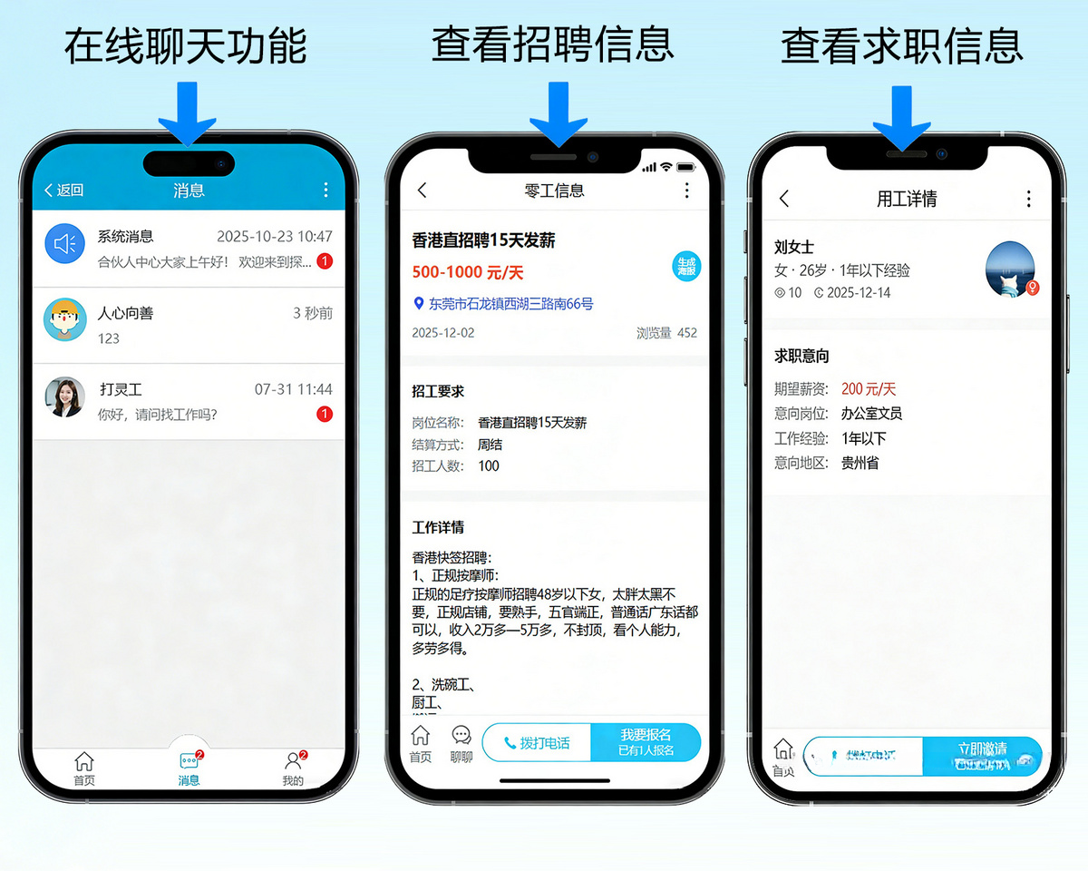 企业可以在用工大厅,选择工人,发起主动邀请;