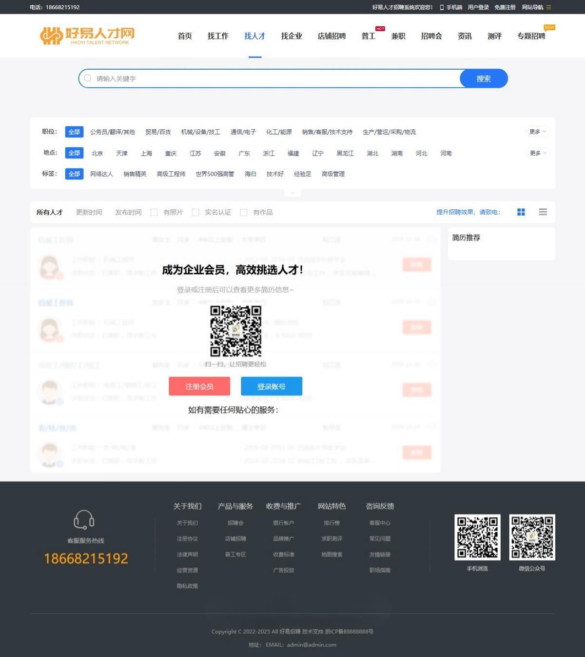 源码说明:PHP开发的人才招聘系统源码/招人系统/人才系统/兼职全职招聘PC/WAP/公众号开源版,一款开源的PHP人才招聘系统,可以一键搭建一款属于自己的人才招聘系统,系统是全开源的,支持二次开发定制,功能是比较完整的,支持多端访问,有需要的可以下载学习研究!!!